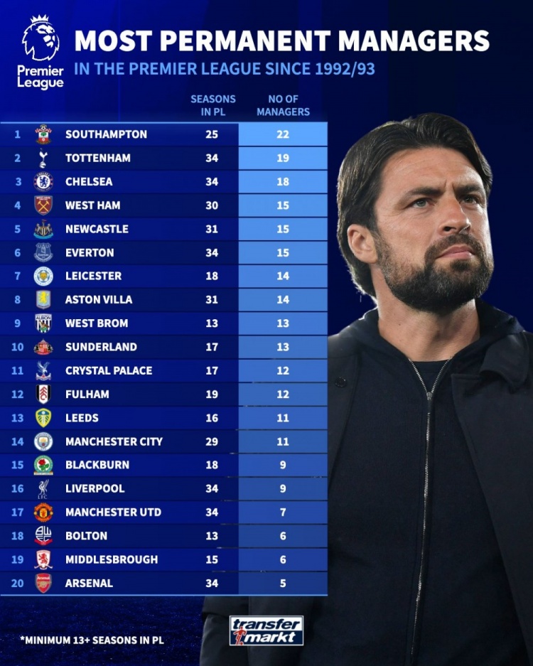 德转列英超各队历史正式主帅榜:(至少在英超13个赛季)